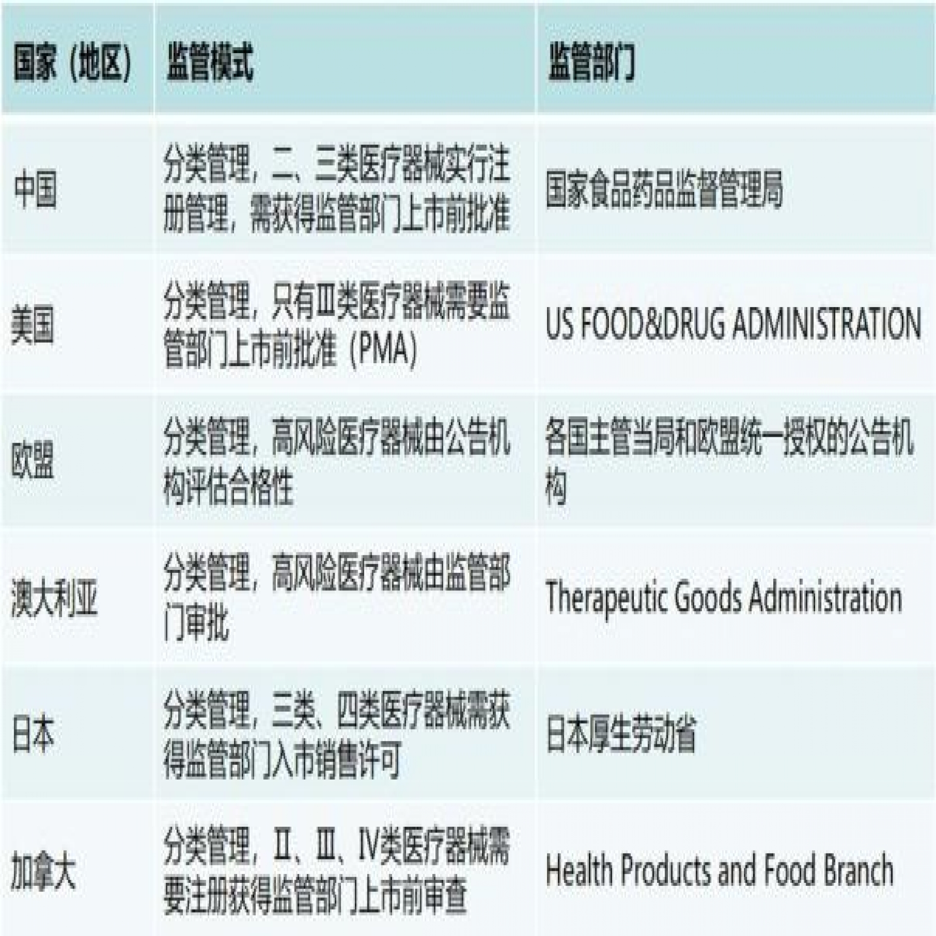 國(guó)內(nèi)外醫(yī)療器械監(jiān)管模式與監(jiān)管部門對(duì)比