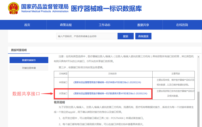 醫(yī)療器械唯一標(biāo)識(shí)數(shù)據(jù)庫(kù)設(shè)置接口對(duì)接的數(shù)據(jù)共享方式,點(diǎn)擊首頁(yè)“數(shù)據(jù)對(duì)接說(shuō)明”欄目,在線填報(bào)對(duì)接申請(qǐng)并獲取對(duì)接授權(quán)碼。下載《國(guó)家藥品監(jiān)督管理局醫(yī)療器械唯一標(biāo)識(shí)數(shù)據(jù)庫(kù)共享API標(biāo)準(zhǔn)文檔》最新版(圖4所示),按文檔要求開發(fā)對(duì)接功能,經(jīng)聯(lián)調(diào)測(cè)試通過(guò)后,用戶可通過(guò)接口獲取數(shù)據(jù)。